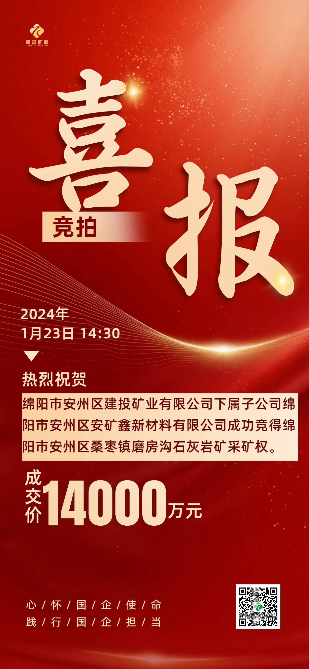 喜報|綿陽安州礦產(chǎn)資源集團有限公司下屬子公司綿陽市安州區(qū)安礦鑫新材料有限公司成功競得綿陽市安州區(qū)桑棗鎮(zhèn)磨房溝石灰?guī)r礦采礦權(quán)
