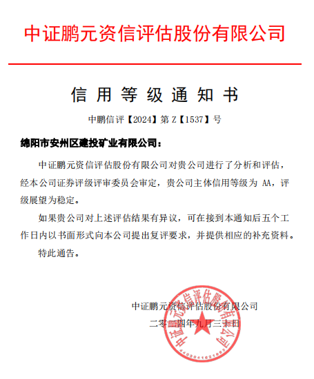 喜報(bào)丨綿陽(yáng)安州礦產(chǎn)資源集團(tuán)有限公司成功獲評(píng)AA主體信用評(píng)級(jí)